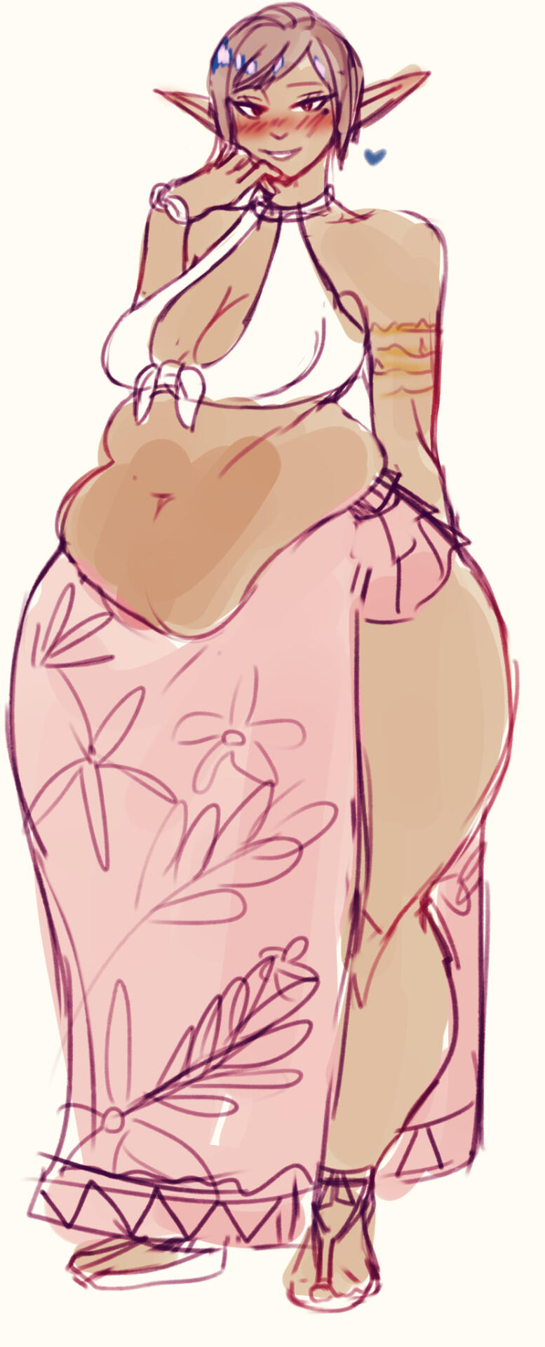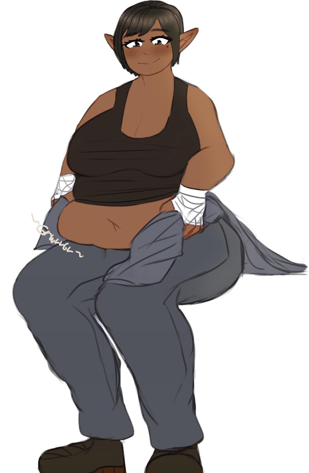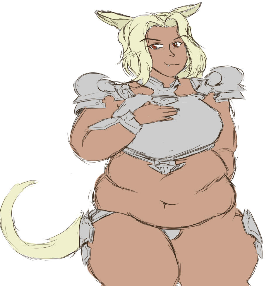 A gluttonous gladiator, O'raha is a well known fighter in the Ul'dah arena. She is known for fighting hard and partying hard, gorging herself after every victory. She can be rude, aggressive, and standoffish, but given enough time she reveals she's just as soft as her chubby tummy.